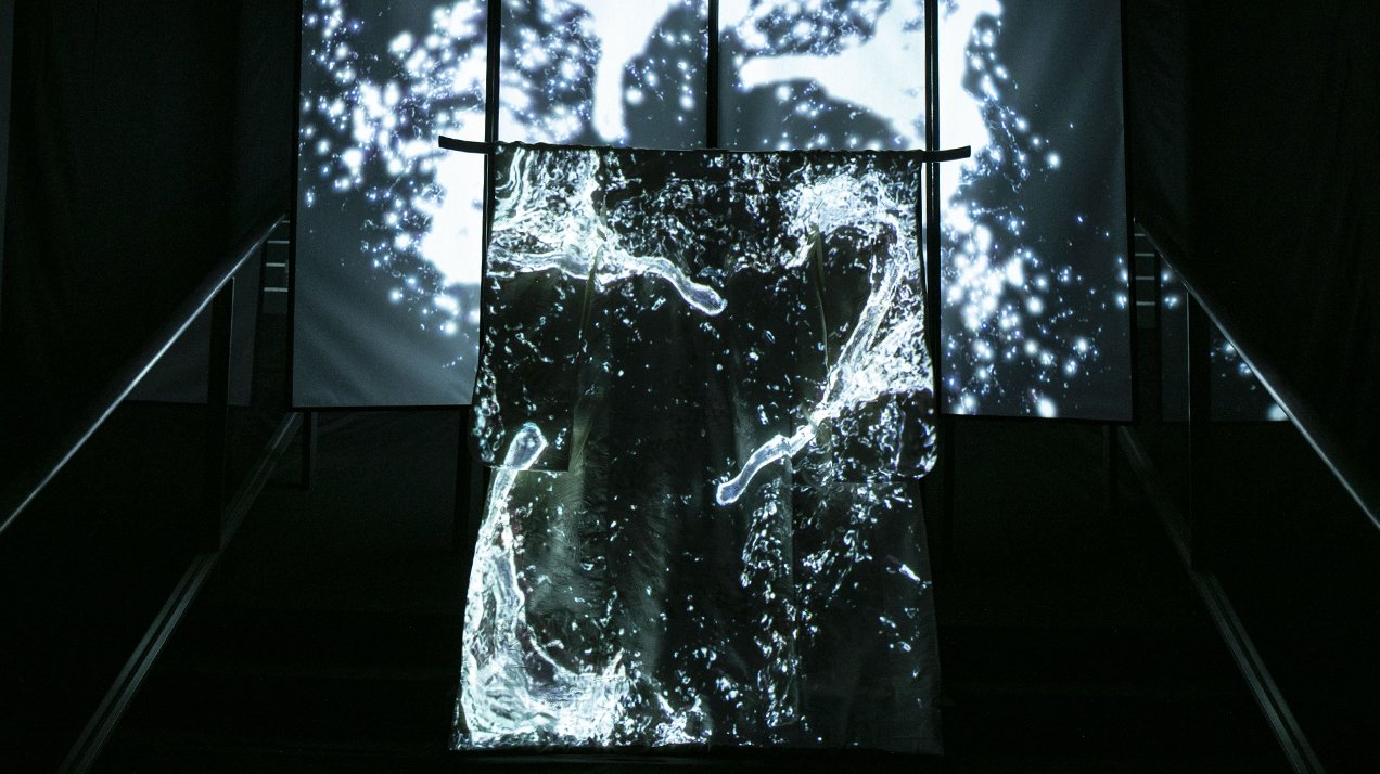 この構成の核は、屏風を「額」として機能させる演出設計にあります。白い着物単体では、投影された意匠は着物の輪郭で閉じてしまう。背後に屏風を据えることで、着物を囲む世界観そのものが立ち上がり、意匠が映える「額」が生まれます。