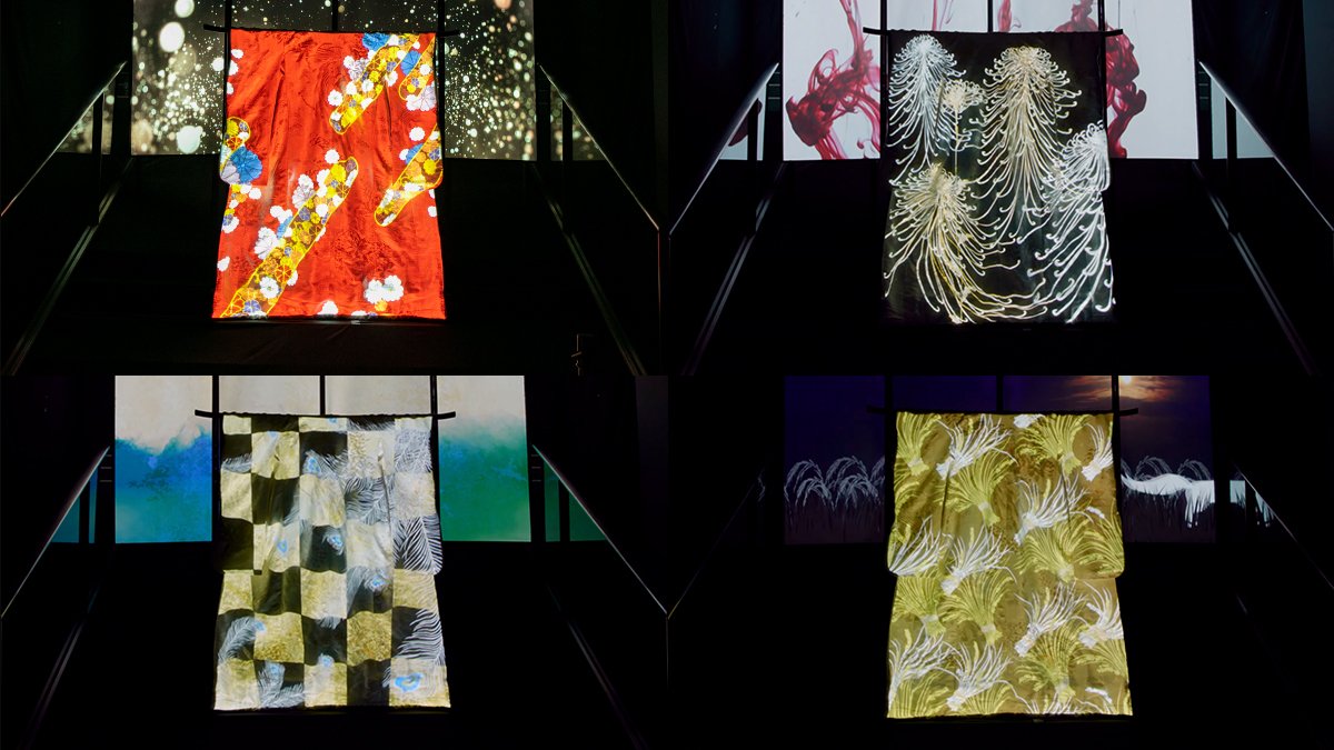 来場客は、エントランス「迎」で白い着物が山口美術織物の意匠へと「化ける」瞬間に立ち会い、その先の「雅」で本物の時代衣装と対面する。「化けた姿」と「本物」の両方を一つの動線で体験する構成が、伝統工芸とデジタルアートの関係性を空間として成立させています。