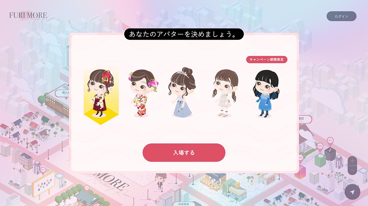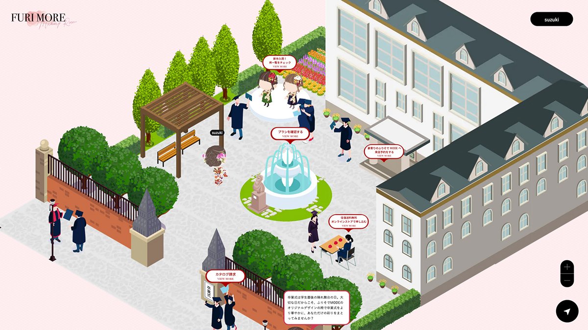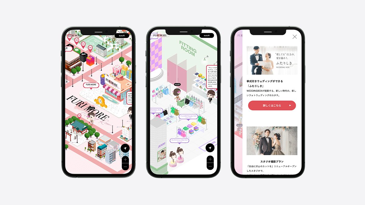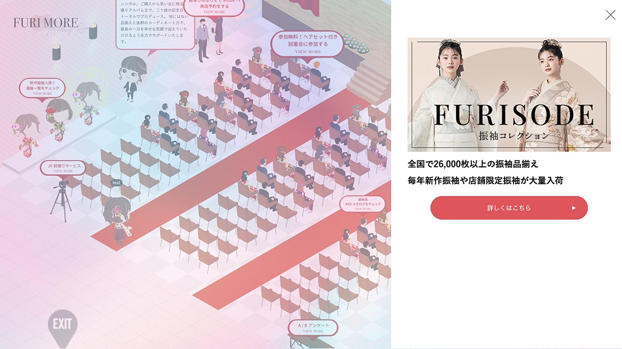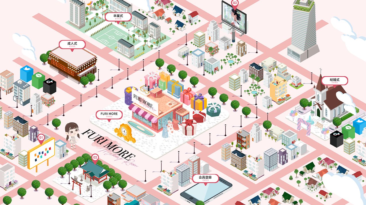 さらに、七五三、成人式、卒業式、結婚式とテーマ別にエリアを設計。情報を点で並べるのではなく、街全体で世界観を表現することで、単発のキャンペーン接触では得られないブランド理解を実装しました。回遊するほどに記憶に残る構造とすることで、認知で終わらない接点へと昇華しています。