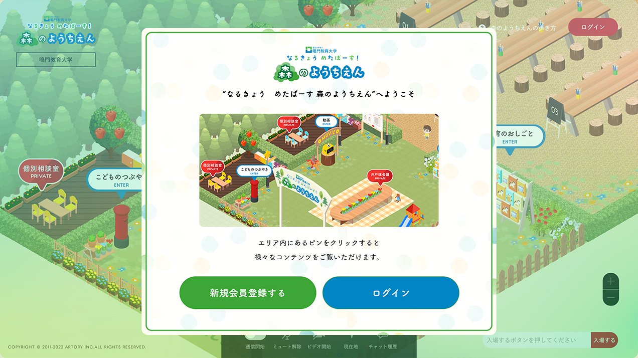 ARTORYが構築したのは、「なるきょう めたばーす! 森のようちえん」です。実際の幼稚園をそのまま再現するのではなく、幼児教育の魅力を直感的に届けるために、世界観そのものを設計するアプローチを採用しました。