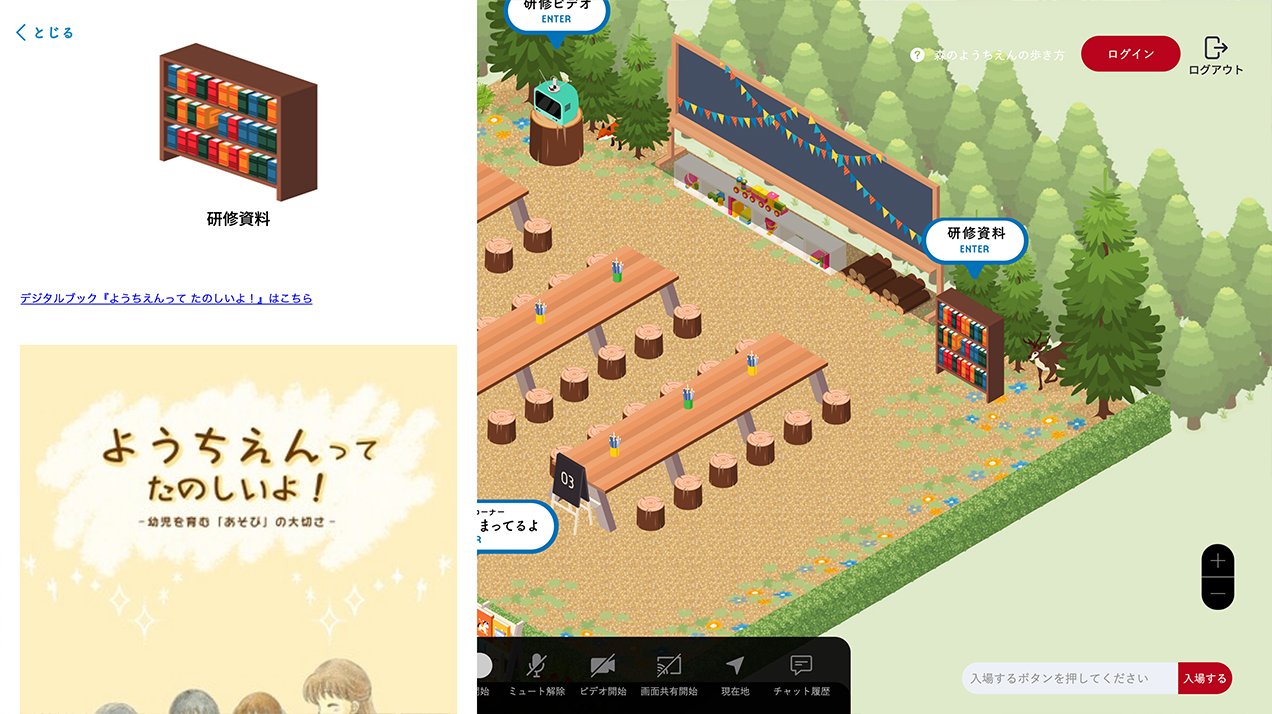空間内には三つのエリアを設計しました。「保育室」では模擬授業を体験し、幼稚園教諭の仕事の中身を具体的にイメージできる構成としています。アバターを介して参加するため、対面よりも心理的ハードルを抑えた状態で授業に向き合える設計です。