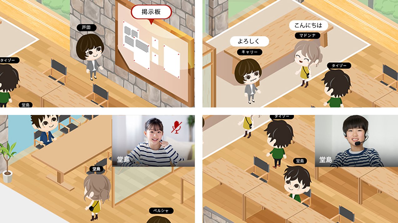 メタバース空間設計(「休み時間」コンセプト) / UX・UI設計(4段階参加方法) / 空間デザイン(屋内・木材×石材) / システム開発 / テキストチャット機能 / チャットログ機能 / CMS機能付き掲示板 / ユーザー行動分析機能