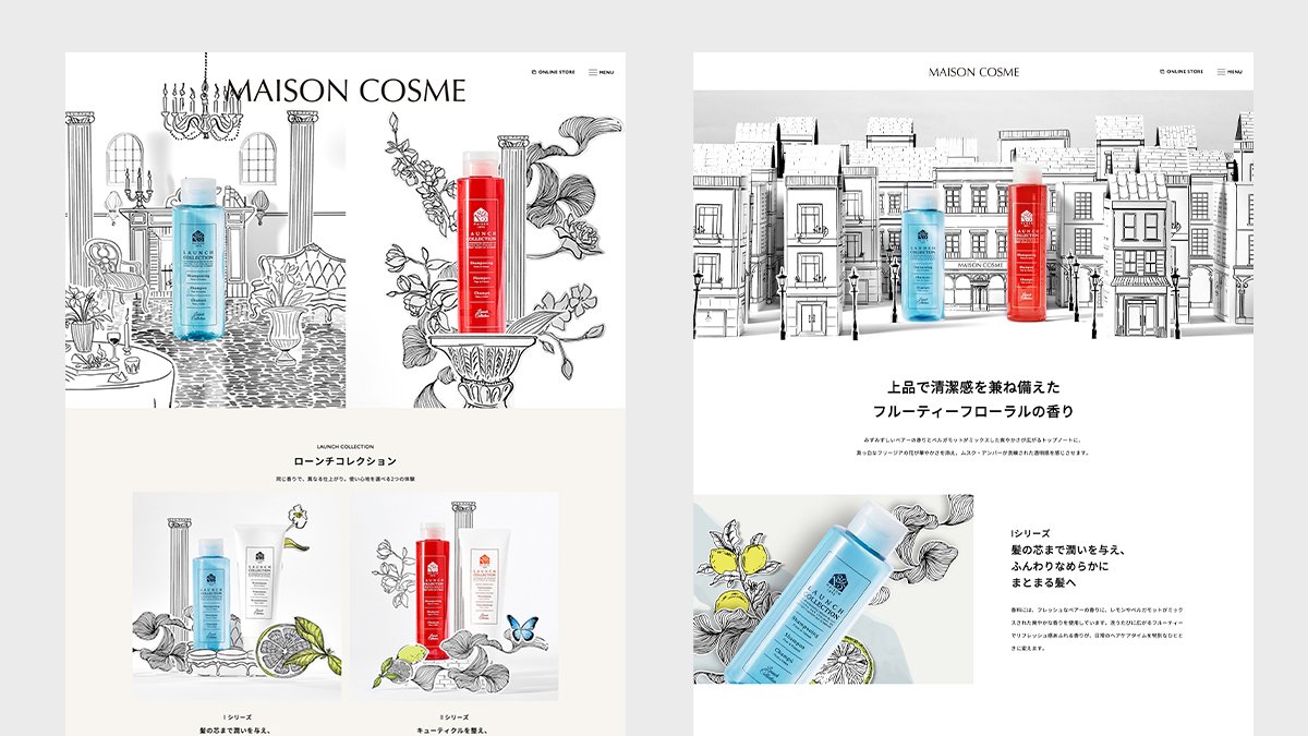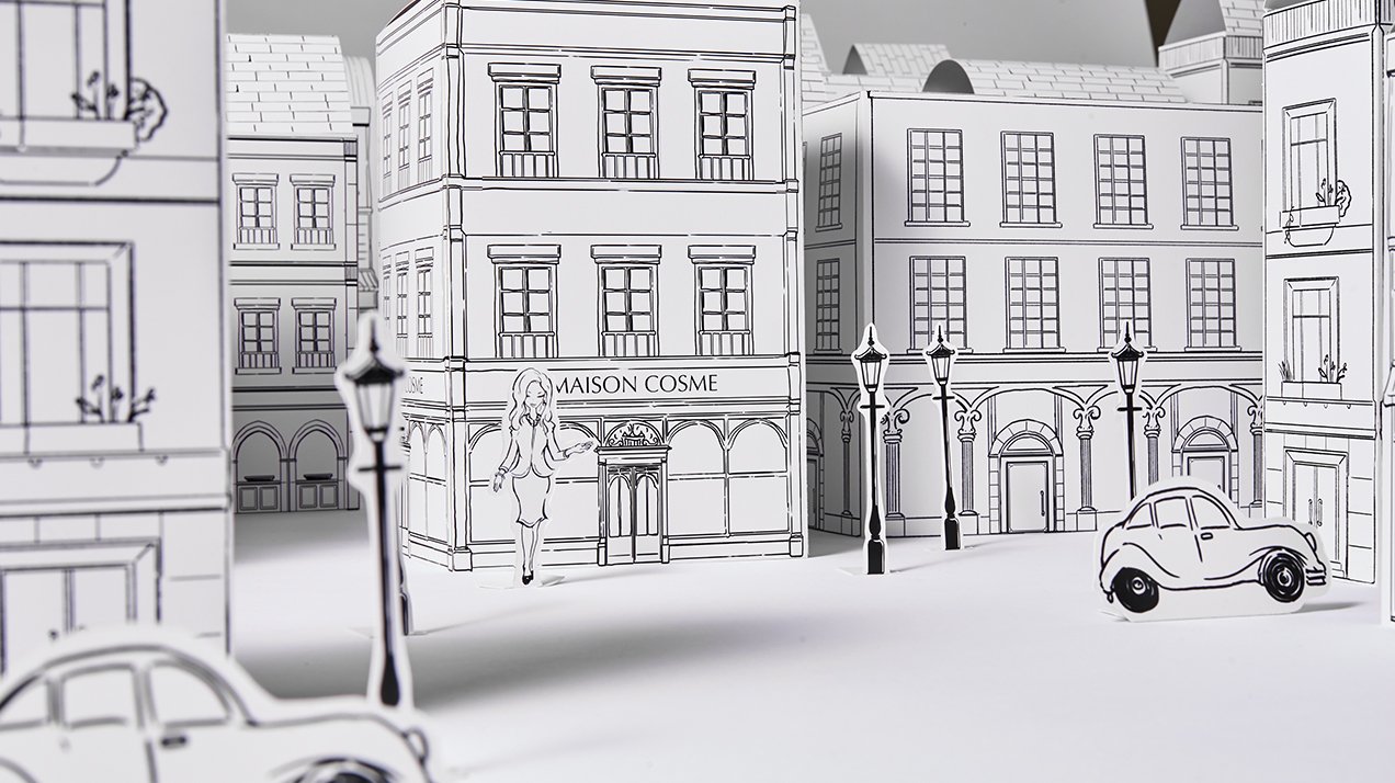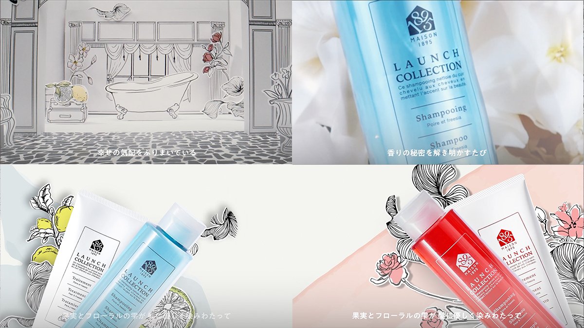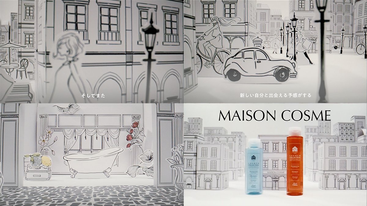 ブランドの舞台となる架空の街「メゾン」をモノクロのペーパークラフトで制作し、シャンプーやリンスそのものを主役にした映像を構成。プロダクトを見せるのではなく、空気感や余韻から価値を感じ取れる流れに置き換えることで、香りや使い心地が自然に立ち上がる入り口を整備しました。