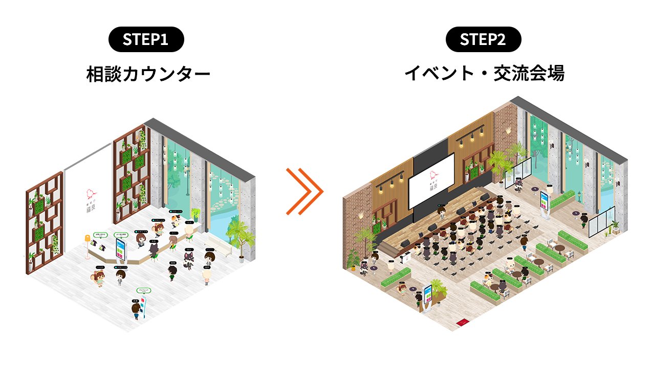 そこで、最初のステップは「カウンセラーとの1対1の相談」に設定しました。知らない参加者ではなく、プロのカウンセラーが相手。アバターでのコミュニケーションに慣れてもらいながら、婚活への不安や希望を話せる場として。この段階で「アバターでも普通に話せる」という体験をしてもらい、次のステップとして、複数人が参加するセミナーやイベントの場へ。そして、その先に婚活イベントや交流会を設計しました。段階を踏むことで、心理的な準備ができた状態で次のステップに進んでもらうことが狙いでした。
