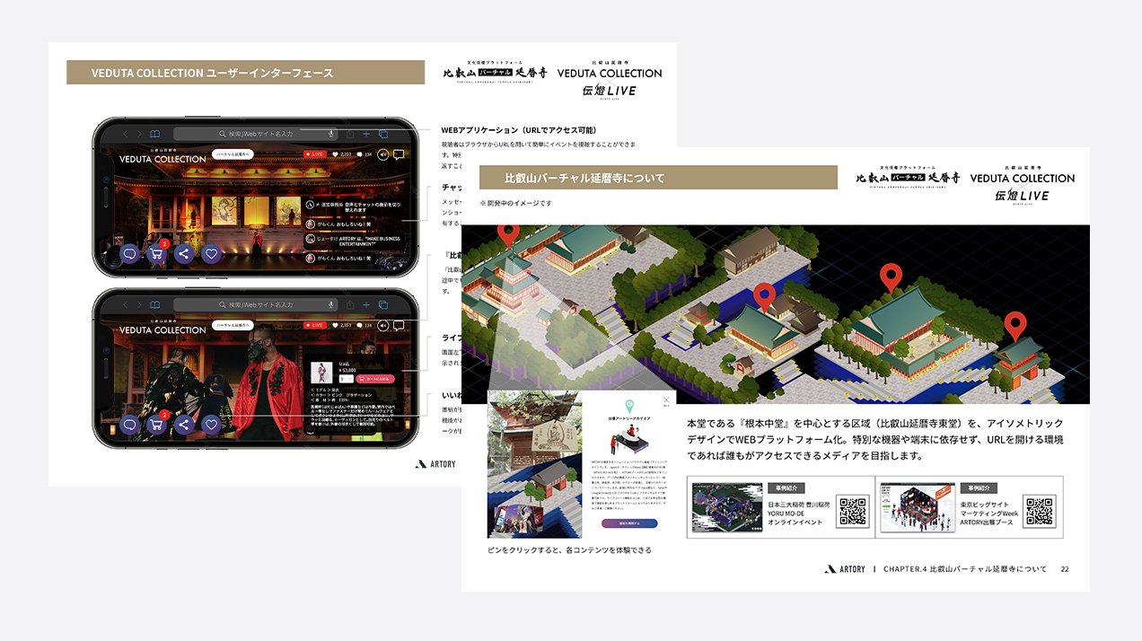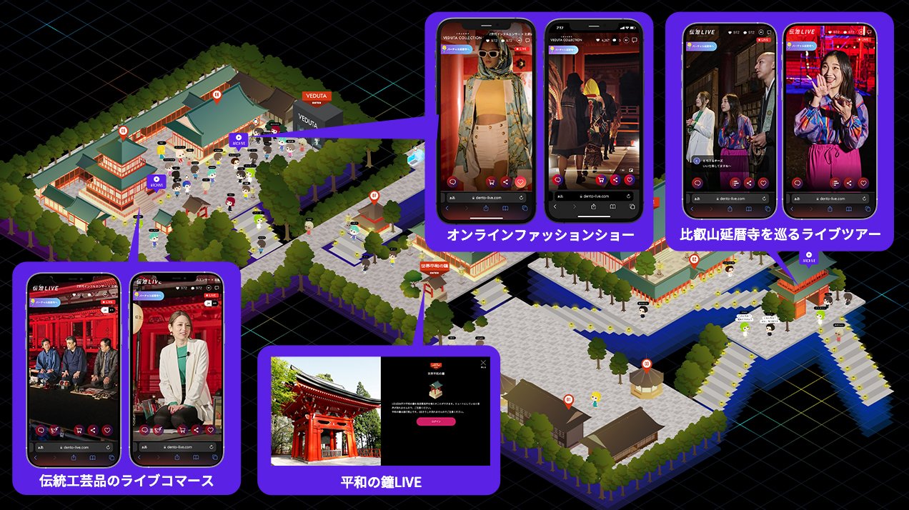 世界中からブラウザひとつでアクセスでき、アバターで境内を歩き、ライブ配信を視聴し、他のユーザーとチャットできる。協賛企業のSDGsに触れ、平和の鐘を鳴らす。イベント終了後もアーカイブとして残り続ける。比叡山延暦寺は、日本文化を世界へ発信する継続運用可能な基盤として始動しました。