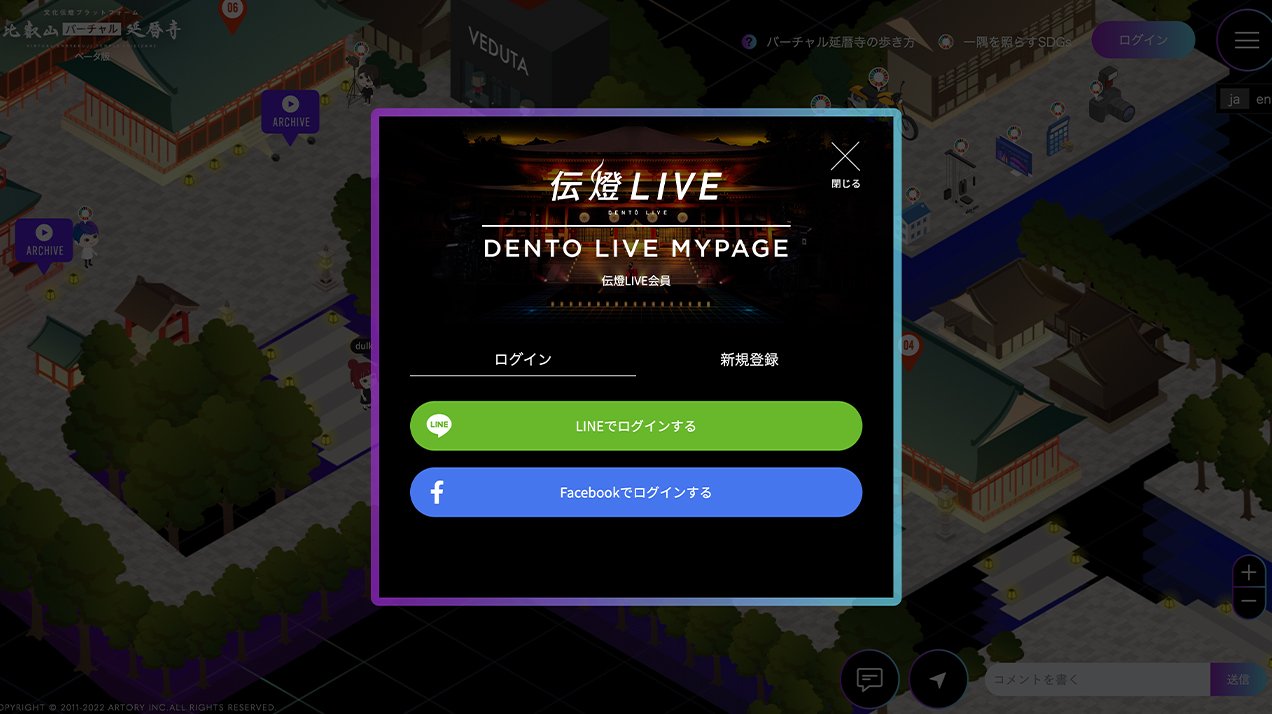 2022年10月10日に開催されたオンラインイベント「伝燈LIVE」では、メタバース空間がイベントの運営基盤として機能しました。当日の3つのライブ配信には、バーチャル延暦寺上からアクセスできる導線を設計。メタバース空間をオンラインイベントの基盤として活用する構成です。