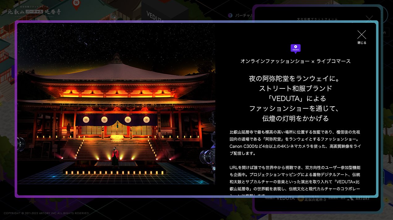 きっかけは、VEDUTAのファッションショーでした。比叡山延暦寺でオンラインイベント「伝燈LIVE」を開催するにあたり、イベントのホーム画面となるプラットフォームが求められました。