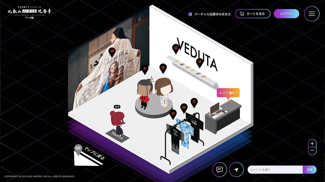ARTORYは、比叡山延暦寺の東塔エリアをメタバース空間として再現しました。国宝・根本中堂を含む境内をアイソメトリックデザインで構築し、「比叡山バーチャル延暦寺」をイベントに先駆けた2022年10月1日に公開しました。