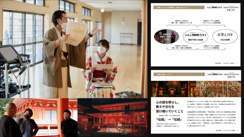 1200年の歴史を持つ世界遺産・比叡山延暦寺「阿弥陀堂」の回廊と特設ステージをランウェイに、着物を現代風にアレンジしたブランド「VEDUTA」のファッションショーを開催。シネマカメラ5台体制で撮影し、延暦寺の境内で収録した音をサンプリングしたBGMとともに、世界51カ国・25,000人以上に配信。企画構想から空間設計・映像制作・音楽・配信までを一貫してプロデュースしています。