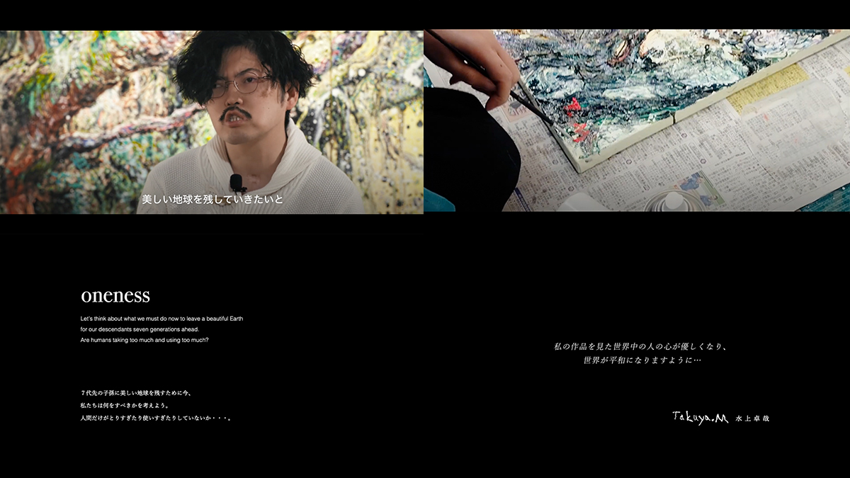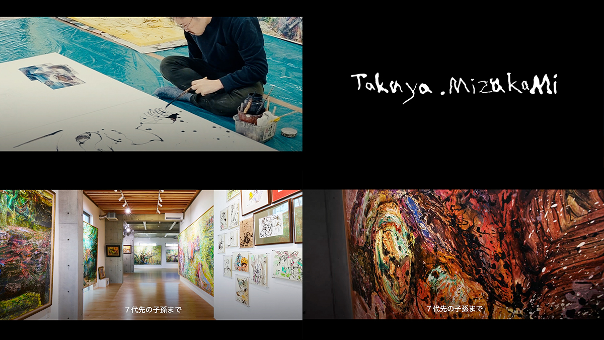 本映像は、2025年3月2日に開催された個展『燦々』のレセプションイベントにて、特別映像として披露されました。単なる作品紹介ではなく、水上氏の表現の本質に触れることができる短編ドキュメンタリーとしての演出を意識し、イベントの終盤に上映することで、来場者の記憶に深く残る感動的な締めくくりとなりました。